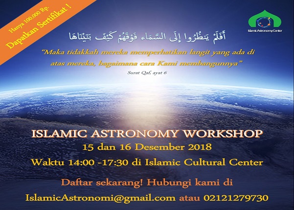 Jika Anda ingin mengetahui jawaban dari pertanyaan-pertanyaan ontologis tentang asal muasal manusia? Tentang bagaimana alam semesta diciptakan? Di mana posisi kita di alam semesta dan apa yang akan terjadi selanjutnya? Dan seterusnya maka segera daftarkan diri Anda dan hadiri program “Islamic Astronomy Workshop.”
