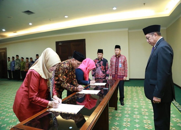 Hadir sebagai saksi, Sekretaris Jenderal Kemenag M. Nur Kholis Setiawan dan Direktur Jenderal Pendidikan Islam Kamaruddin Amin.